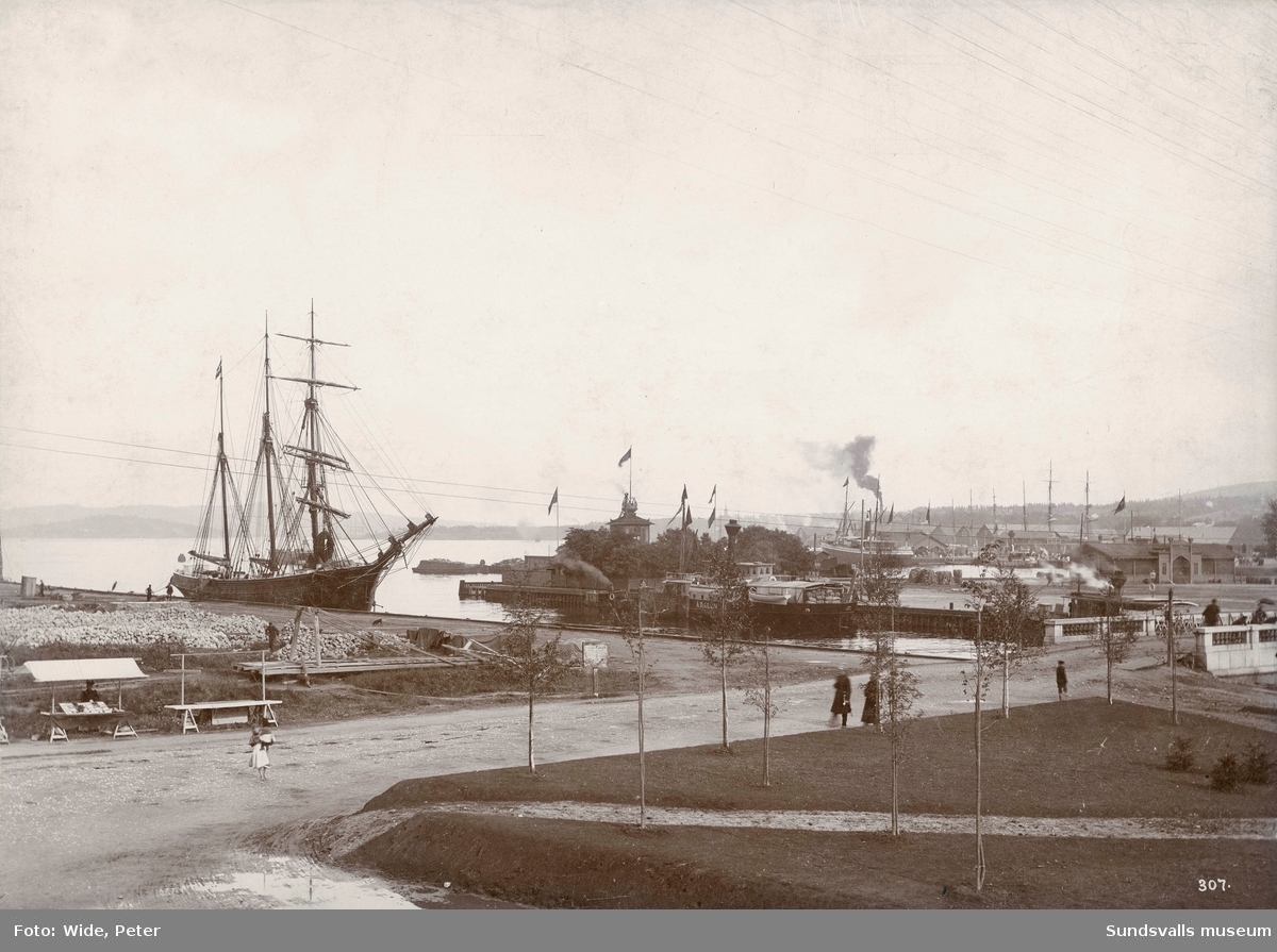 Kallbadhuset i hamnen med båtarna Svartvik, Enig, Rudolf samt Neptun vid kajen. Kallbadhuset uppfördes 1878 och lades ned 1910. Platsen ansågs olämplig på grund av de orenheter som fanns i vattnet, bland annat det orenade kloakvattnet som släpptes ut i Selångersån. Foto och text: Sundsvalls museum, fotograf Peter Wide, bilden är tagen 1902.